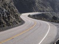 This is an image of an empty long straight highway passing through a mountain range in Big Sur, California, USA. The coastal road is surrounded by towering cliffs and large rocks. The cloudy day adds drama to the landscape, while the yellow line on the asphalt road creates contrast. The concrete street and Armco barrier provide a sense of infrastructure. This photo captures the rural beauty and ruggedness of the Pacific Coast Highway. It represents a typical day on this scenic route.