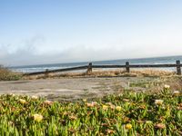 This stock photo showcases a scenic coastal road in California, USA. The road, made of asphalt, runs alongside the picturesque shoreline with sandy beaches and crystal-clear blue waters. Lush green grass and abundant vegetation add to the natural beauty of the landscape. It's a sunny day, with a clear sky and cotton-like clouds scattered across it. The image also captures the tranquility of the scene, with fog gently rolling in from the ocean. In the foreground, colorful spring flowers bloom, adding a vibrant touch to the coastal scenery. The Armco barrier along the road ensures safety for those enjoying recreational activities and beachgoers. This captivating destination invites visitors to arrive and explore the stunning natural environment, providing an ideal backdrop for various outdoor activities. The photo exudes a sense of gloominess due to the presence of gloomy grey skies and contrails in the distance, but its overall beauty and charm remain undiminished.
