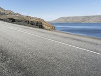 a road next to a lake with two large rocks on the sides of it and hills in the background
