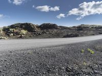 a motorcycle driving on the road on a sunny day in iceland, in a natural background, the hills and sky are dotted
