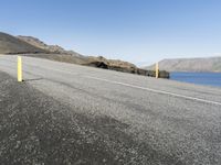 A coastal road in Iceland with stunning views of the rugged landscape. Clear skies and a mountain in the distance create a picturesque scene. A bicycle rests on the side of the paved road.