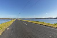 A coastal road winds along the edge of a tranquil lake, with power poles and vegetation lining the way. Beautiful natural landscape with clear skies and the ocean on the horizon.