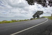 an empty asphalt road with an ocean view in the background and a sign hanging from a tree
