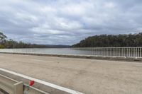 A coastal road winds along the water's edge, surrounded by lush landscape and towering trees. The road surface is smooth asphalt, with a guard rail and fence separating it from the ocean. Clouds float overhead, creating a picturesque scene.