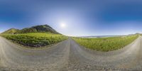 360 - view of gravel road with mountain range in the background with blue sky and cloud