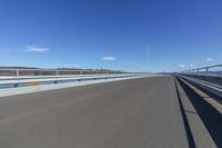 A scenic coastal road winding along the azure ocean, with a clear day and fluffy clouds on the horizon. The road surface is smooth asphalt, lined with guard rails and street lights. A bridge spans over the water.