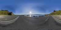 a wide angle view of the ocean and sky and a road leading through it and mountains and a sun in the distance