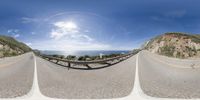 A breathtaking coastal road with the ocean as the backdrop. The sun shines brightly in the clear sky, casting shadows on the asphalt. This scenic route winds through the highlands and offers stunning views of the sea and mountains.