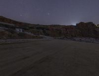 A long exposure shot of a road along the coastal cliffs of Portugal. The mountain side provides a stunning backdrop against the clear sky. The dark night sky is filled with stars.