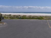 This image showcases an asphalt road leading to a parking lot on the coastal plain of South Africa. The open space is surrounded by nature, with trees and vegetation lining the road. The landscape extends towards the horizon, where the clear sky meets the ocean. The road surface is smooth, perfect for a packshot. The beach and waves add to the picturesque scenery. This photo captures the beauty of South Africa's coastal terrain and the tranquility of the open space.