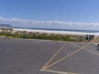 A coastal road in South Africa, with clear skies and a stunning ocean view. The road surface, lined with grass and vegetation, leads to a spacious parking lot. Nature's beauty meets urban infrastructure.