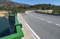 A coastal road in Spain winds along the picturesque landscape, with the clear sky reflecting on the asphalt. The bridge spans over the river, leading to a stunning view of the ocean. Nature at its finest in Europe.