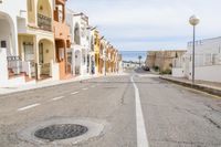 This image showcases the beautiful coastal region of Spain. The low-lying residential homes feature classic architecture, adding a touch of European charm to the scenery. The road, made of smooth asphalt, guides visitors towards the ocean, where clear blue waters meet the horizon. The cloud-filled sky enhances the vibrant colors of the surrounding landscape. This photo captures a typical day in a Spanish coastal town, inviting tourists to explore and enjoy the tranquil atmosphere.