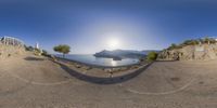 Aerial view of the coastal road in Mallorca, Spain. The sun sets over the clear sky, casting a golden glow on the ocean. The elevated road winds through the landscape, offering a top-down perspective of the Balearic Islands. A picturesque scene of nature and open space.