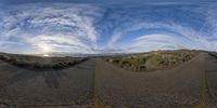 a double image of two roads running along side each other with some clouds and a blue sky in the background