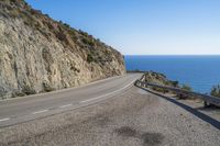 This stunning stock photo captures a narrow paved road on a cliff in Spain, overlooking the crystal-clear waters of the ocean. The road is lined with cars parked in front of a picturesque coastal landscape, surrounded by majestic mountains. The day is bright and sunny, with a clear sky overhead. The road is framed by a rock wall and an Armco barrier, ensuring safety along the scenic route. This captivating image showcases the natural beauty and unique charm of Spain's coastal landscapes in Europe.