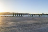 the sun sets behind a wooden fence next to a body of water and mountains behind