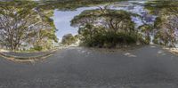 A gloomy day in a coastal suburb. The grey sky casts a shadow over the residential area, while trees line the road. Upside-down view offers a unique perspective of the tranquil landscape.