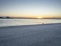 A breathtaking coastal landscape at dawn in Lisbon, Portugal. The photo features a picturesque road with asphalt leading towards the scenic coastal water. The open space and natural beauty of the landscape are highlighted by the sunlight and clear sky above the ocean. A pier and jetty can be seen in the distance, adding to the picturesque atmosphere of the image. The afterglow creates a stunning red sky in the morning, creating a harmonious scene in the harbor. This photo is perfect for showcasing the natural beauty and recreational opportunities in Lisbon, Portugal, a sunny city in Europe.