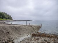 Gloomy day on a coastal landscape with a grey sky. A dirt road leads to a boat ramp at the edge of the lake. Nature and recreation come together in this gloomy but beautiful scenery.