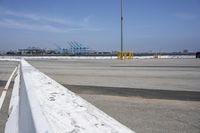 This stock photo showcases a coastal urban scene in Los Angeles, California, USA. The image captures a parking lot with the view of the sea and a crane in the distance, while a large truck dominates the foreground. The asphalt road and concrete infrastructure create a bustling city atmosphere, blending with the coastal water and the open space of Long Beach. The clear sky above is laced with contrails, echoing the urban hustle and industrial nature of the area. The foreground features an industrial factory, bridge, and lane, emphasizing the transportation and infrastructure of this vibrant city. With a stunning view of the ocean and pier, this packshot encompasses the essence of urban life and coastal beauty in California.