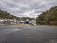 A gloomy day at the coastal pier. Grey sky contrasts with the calm lake waters. Boat ramps and jetty provide access to the open space for boating and vehicle landing. Vegetation surrounds the asphalt road leading to the pier.