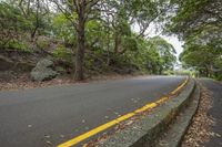 Gloomy coastal landscape with a grey sky and ocean in the background. A residential road surface is lined with trees and vegetation, creating a gloomy suburban scene.