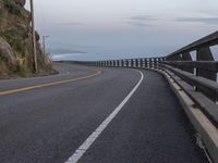 A picturesque coastal view in California at dawn. The empty road winds through the mountainous landscape, lined with a guard rail and rock wall. Clear skies and distant contrails complete the serene scene.