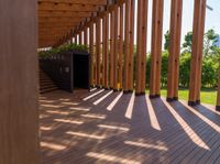 A coastal walkway in Hong Kong with a wooden floor that casts beautiful shadows in the daylight. The design allows for sunlight to illuminate the path, creating a serene atmosphere by the ocean.