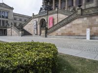 A sunny spring day in Berlin, Germany. The city's classic architecture and cobblestone streets provide a charming backdrop. The Alte Nationalgalerie, a beautiful museum, stands amidst vibrant vegetation and flowers in full bloom.