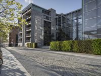 This stock photo showcases a cobble stone sidewalk in front of residential and office buildings in Berlin, Germany. The modern architecture of the buildings and the vibrant city life create a dynamic atmosphere. The sidewalk is adorned with plants and trees, providing a touch of nature in the urban setting. The clear sky adds to the beauty of the scene. This image captures the essence of urban design in a metropolitan area, reflecting the European charm of Germany's capital city.