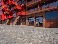 This stock photo features a cobbled sidewalk outside of a very tall red building with balconies and windows in Berlin, Germany. The architecture of the building is a perfect blend of modern and residential design. The vibrant red brick walls, along with the cobblestone surface of the road, give the city a unique urban appeal. The building can be seen as a possible hotel or office building, situated in the heart of Berlin's business district. The image captures the essence of Berlin's rich history and its thriving art district, making it a suitable choice for projects related to European business, museum or art district concepts.