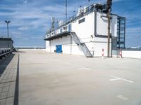 A view of a parking garage in Berlin, surrounded by an open urban space. The cobblestone surface, contrasting with the cityscape and clouds, adds to the urban design aesthetic. Cars parked next to the building suggest an airport nearby.