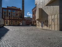A classic architecture courtyard in Berlin, Germany, with modern and urban design elements. Hard shadows cast on cobblestone surfaces under a clear European sky. A blend of historic warehouse storage and open urban spaces.