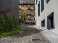 A serene cobblestone courtyard in Porto, Portugal, under a clear sky. The traditional European surface of the driveway leads to an inviting entry. Experience a peaceful day in this Hinterhof.