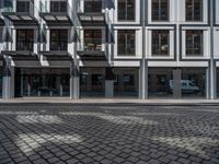 A daytime view of a modern office building in Berlin's business district. The hard shadows cast on the cobblestone road and residential areas showcase the unique architecture of urban design in this European city.
