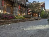 This image captures the charm of a residential area in Lijiang, Yunnan, China. The historic architecture of the homes and buildings provides a glimpse into the past. Cobblestone roads wind through the neighborhood, leading to small alleyways and side roads. The clear sky overhead adds to the picturesque scene, while the vegetation and tree-lined streets create a peaceful and inviting atmosphere. This photo showcases the beauty and tranquility of a suburban village in Yunnan, making it a great representation of the area's real estate and residential properties.