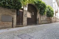 A charming cobblestone street in a classic Italian village. The stone walls and brick buildings showcase the timeless architecture of Europe. A doorway and planter add character to this picturesque residential road.