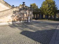 A classic architecture cityscape in Berlin, Germany. Cobblestone streets and brick buildings create a charming town ambiance. Autumn sunlight casts shadows on the castle and urban plaza. Clear sky adds to the beauty of this European urban design.