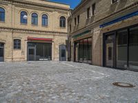 A bustling city scene in Berlin, Germany's urban business district. Cobblestone streets lead to brick buildings and open spaces. Warehouses and storerooms line the courtyard, highlighting European urban design.