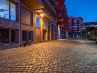 Nighttime in Berlin, a city where modern architecture blends with historic brick walls. Cobblestone streets illuminated by street lights. Urban design at play in a European warehouse district.