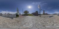 A fisheye view of a cobblestone walkway in Bremen, Germany, leading to a beautiful waterfront. Modern architecture and high-rise buildings line the residential area. The clear sky reflects on the calm water, creating a serene landscape.