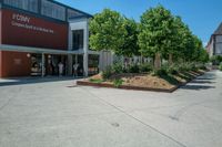This image showcases an open space in the old town of Colmar, France. The urban design features a clear sky and a surface of asphalt that leads to an empty parking lot. People can be seen coming out of the lot, adding a sense of movement to the scene. Bushes next to the building add a touch of greenery to the urban landscape. This photo captures a typical day in Colmar, where the old town meets modern urban elements.