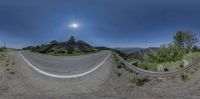 three fisheye image with a bend road between two mountains in the distance, with a man riding a skateboard below