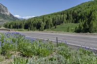This image captures the natural environment of Crested Butte, Colorado. The landscape features an elevated slope covered in vegetation, including trees and grass. The clear sky enhances the beauty of the high mountain forests surrounding the area. A road, known as Slate River Road, can be seen winding through the scenery. This photo represents a typical day in the beautiful biome of Crested Butte, USA.