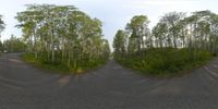 the camera is taking an image of two vehicles parked in front of trees on a country road