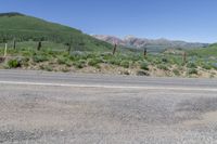 mountains in the background with trees, bushes and a road sign near a street sign