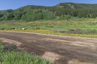 A green and lush landscape in Washington Gulch, Colorado. The dirt road leads to a mountainous forest, perfect for off-road recreation. Clear skies and natural surroundings make it an ideal destination for nature lovers.