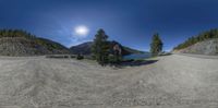 A scenic view of a road along the edge of Taylor Park Reservoir in Crested Butte, Colorado. The clear sky reflects on the calm water, surrounded by lush vegetation and majestic mountains.