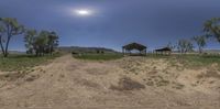 the two cows are on a grassy field outside of a covered structure and one has a tent in the distance